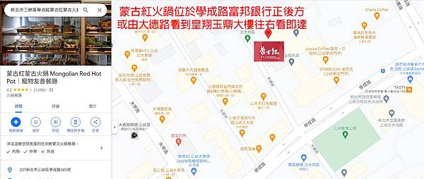 比較建議由大德路皇翔玉鼎樓牌往右看即可看到紅底白字"蒙古紅火鍋的招牌"
