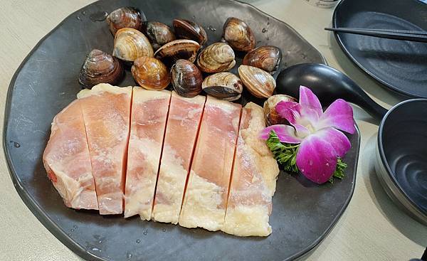 蛤蠣超大且新鮮,他上桌的時候還是活的唷!另外雞腿肉很Q彈很好吃也很大塊唷~