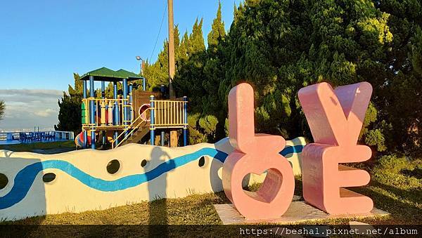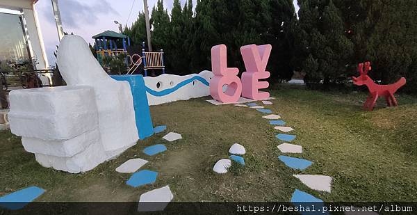 停好車就可以看到庭院裡有一個超大的兒童遊憩溜滑梯還有乳牛LOVE麋鹿等造景,那個大大的讚敲可愛的每個人來應該都會跟他拍照吧!
