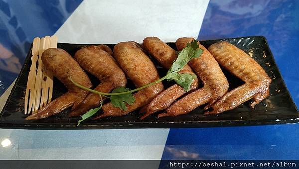 紹興酒雞翅~~一份有六隻,這應該事先處裡浸泡紹興酒,烤炙後淡淡的酒香味還有外皮很脆香~讚!