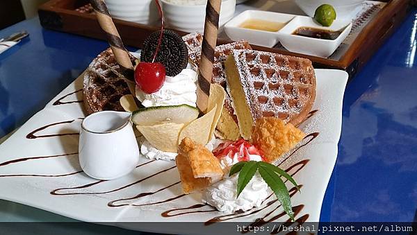 楓糖鮮奶油鬆餅:白圍牆的鬆餅好厚實,很香濃旁邊還搭配了好多可愛的零食~脆笛酥.洋芋片.鮮貝.櫻桃..整個擺盤超級美的,且上面的餅乾正巧都是我很喜歡的!!