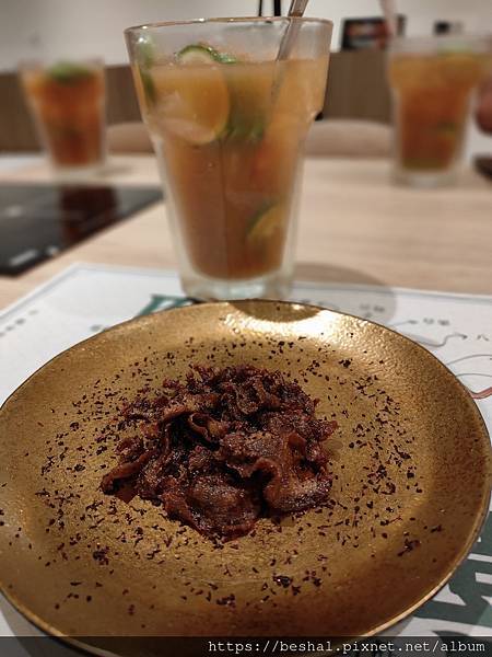開胃菜來的是紫蘇香脆牛舌,薄切的牛舌經過油炸後撒上紫蘇葉粉