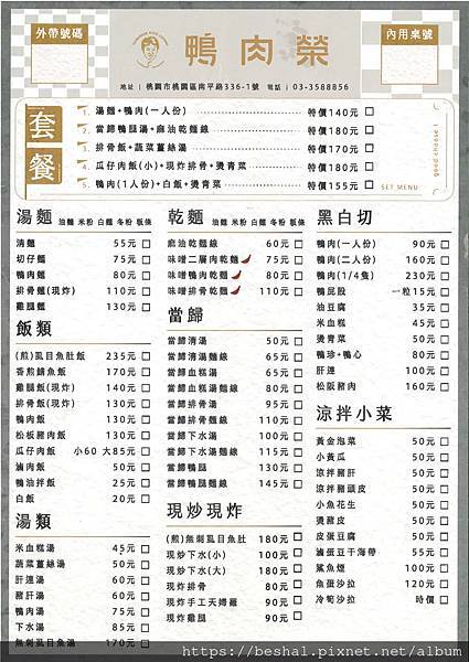 | 鴨肉榮藝文店 電話:03-358-8856 營業時間:11:00~02:00 地址:桃園市桃園區南平路336-1號 粉專: 桃園市美食小吃-鴨肉榮 |