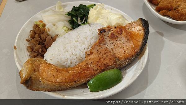 新上市的嫩煎鮭魚套餐$240:鮭魚大片厚度很夠,擠一點檸檬汁吃~超讚,還有附一份飯三樣小菜.很清爽很開胃-好吃!