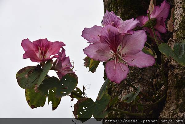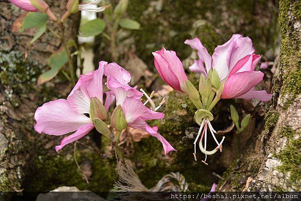 羊蹄甲每年3月至5月落葉後開花,花有5枚粉紅色的花瓣,其中1枚有深紅色條紋。